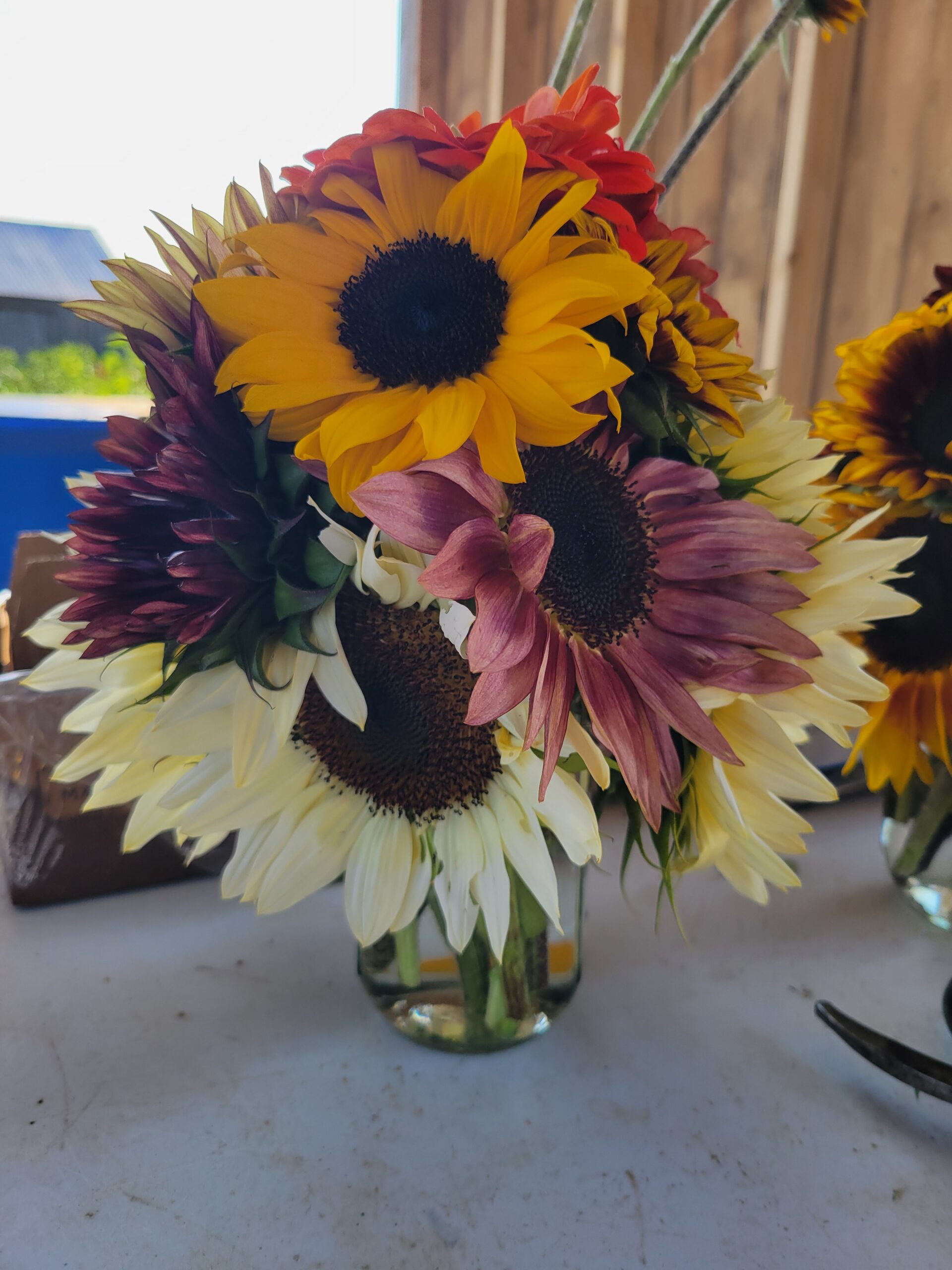 Flower arrangements are our specialties. We love putting together arrangements based on what flowers we currently have in bloom. Choose from a few places to pick up!